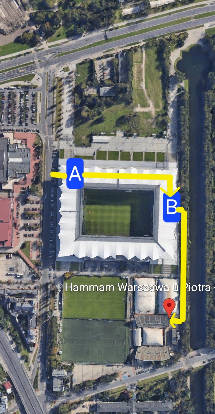 B — Выйдите через ворота у канала и пройдите по набережной к клубу Legia Tennis & Golf.